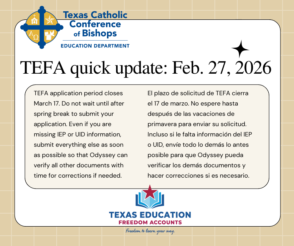 TEFA Quick updates February 5, 2026 TEFA update – March 2 March 2, 2026 TEFA March 1 update March 2, 2026 TEFA update 27 February February 27, 2026 TEFA update 11 February 2026 February 12, 2026 Posted in EFA Resources ← TEFA Special Education Application AssistanceTexas Catholic Voice February 2026 →